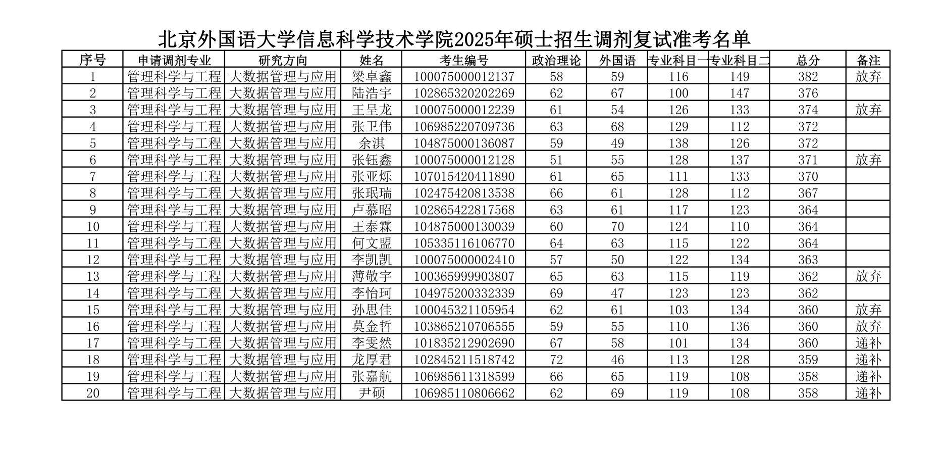 betway西汉姆官网2025年硕士招生调剂复试准考名单
